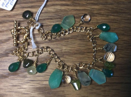 1) Green gemstone charm bracelet: Chrysoprase, Tsavorite Garnet, onyx, prehenite, peridot, idocrase, green gemstone gold vermeil bracelet